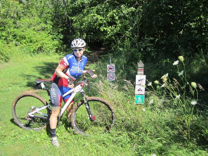 So, we’ve been in Fond du Lac since Saturday night, and both nights, it’s rained enough that we can’t (responsibly, at least) ride the Kettle Moraine trails that we were hoping to visit while we’re here. Yesterday, we headed out on the road, and along the way, we stopped by to check out a really small local system of trails. These are supposed to be multi-use, and the initial entrance to the different trails was marked with what uses are “OK” for what sections of trail, but we quickly found that if you took one trail marked for bikes, that it would dead end at another trail marked as “no bikes.” We rode in circles for about 45 minutes then got frustrated and hit the roads for another 15 miles or so.