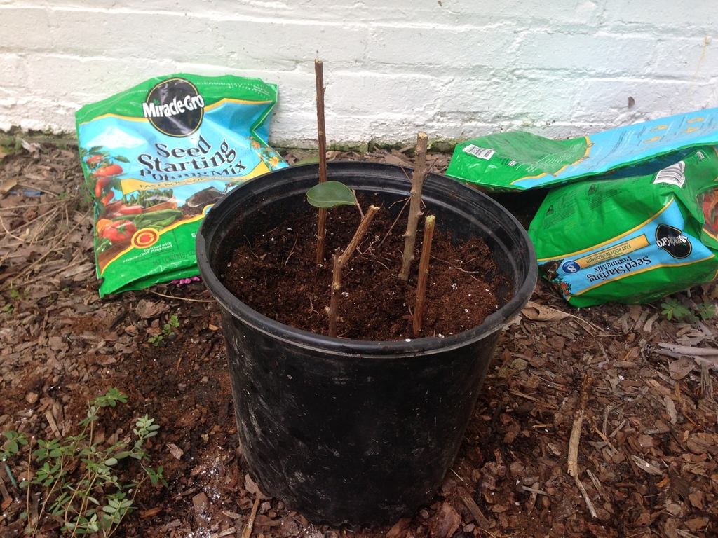 I went to Lowe’s and bought potting soil (even buying in to the special one that’s supposed to be good for this sort of thing) and some rooting hormone powder. Once I was back at their place, my dad took a variety of old/new cuttings, we powdered them, and stuck them into some pots.